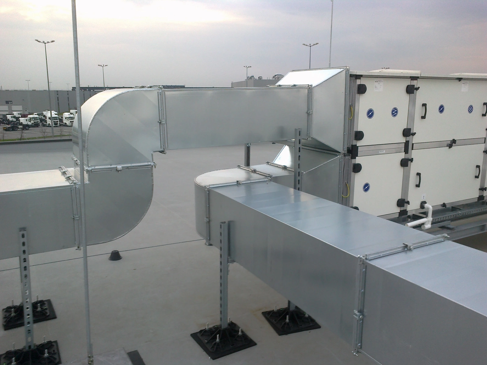Gelieferte Elemente: Elemente für die Montage von rechteckigen Ventilationskanälen auf Dächern. Anti-Vibrationsmatten und Dachfüße ST-ROF-AWL mit Möglichkeit der Einstellung des Neigungswinkels des Fußes gegenüber dem Dach auf bis zu 10o. Montageprofile und -schienen LDB Strut und Winkelverbindungselemente mit schrauben und Muttern für den Bau der H-Frame Konstruktionen.
